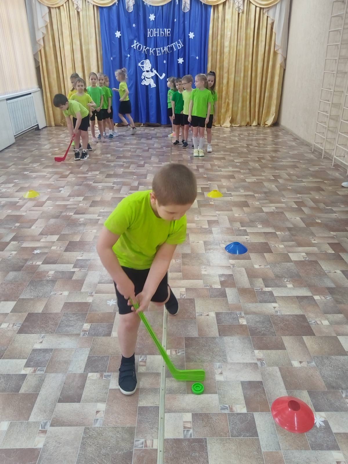 На физкультурном досуге "Юные хоккеисты" ребята старшей группы, выполнив весёлую зимнюю разминку, отрабатывали элементы спортивной игры хоккей: ведение шайбы (мяча) клюшкой по прямой, между ориентирами, броски шайбы с места в цель, выполняли упражнения на развитие равновесия и координации движений.
