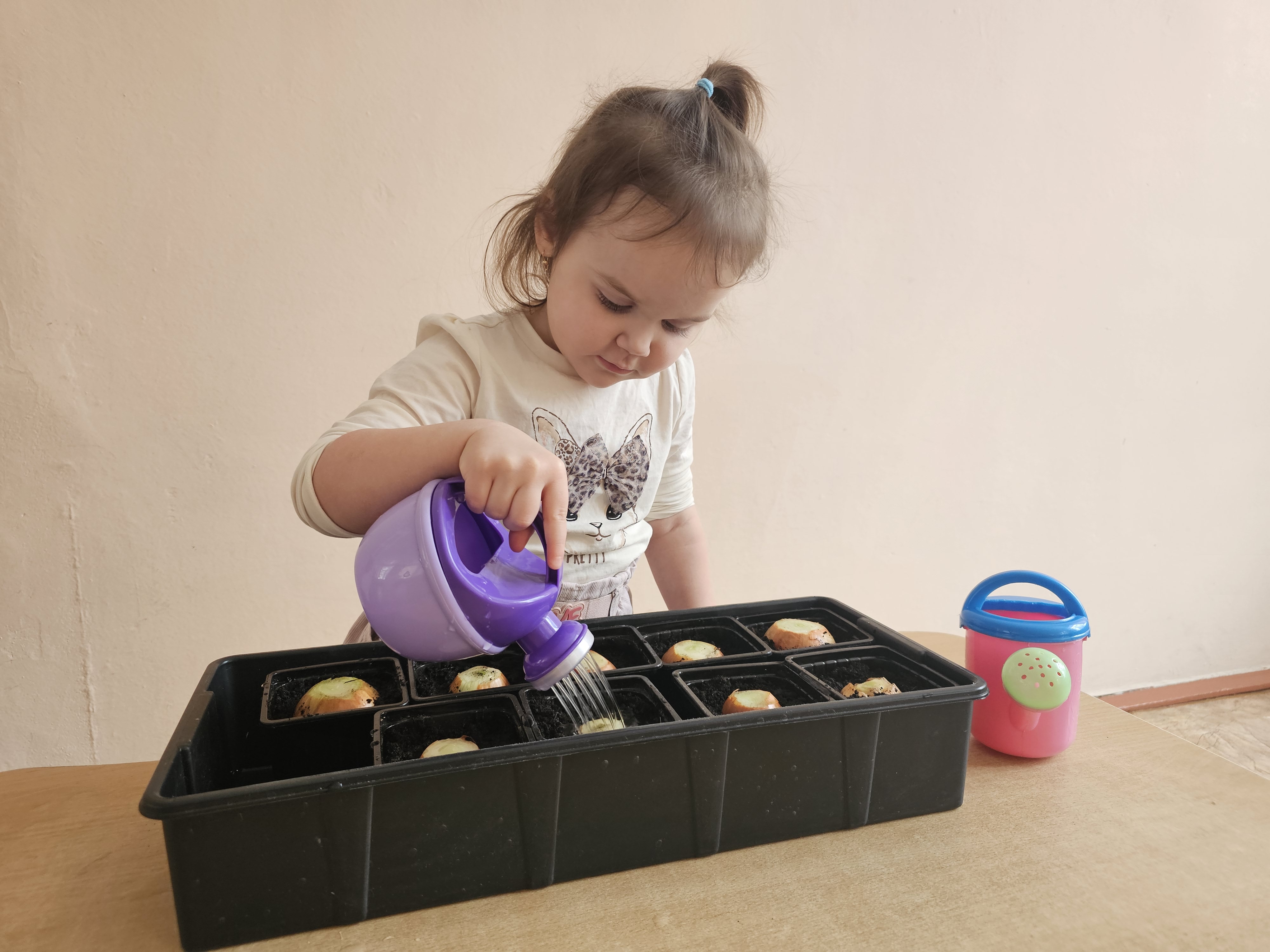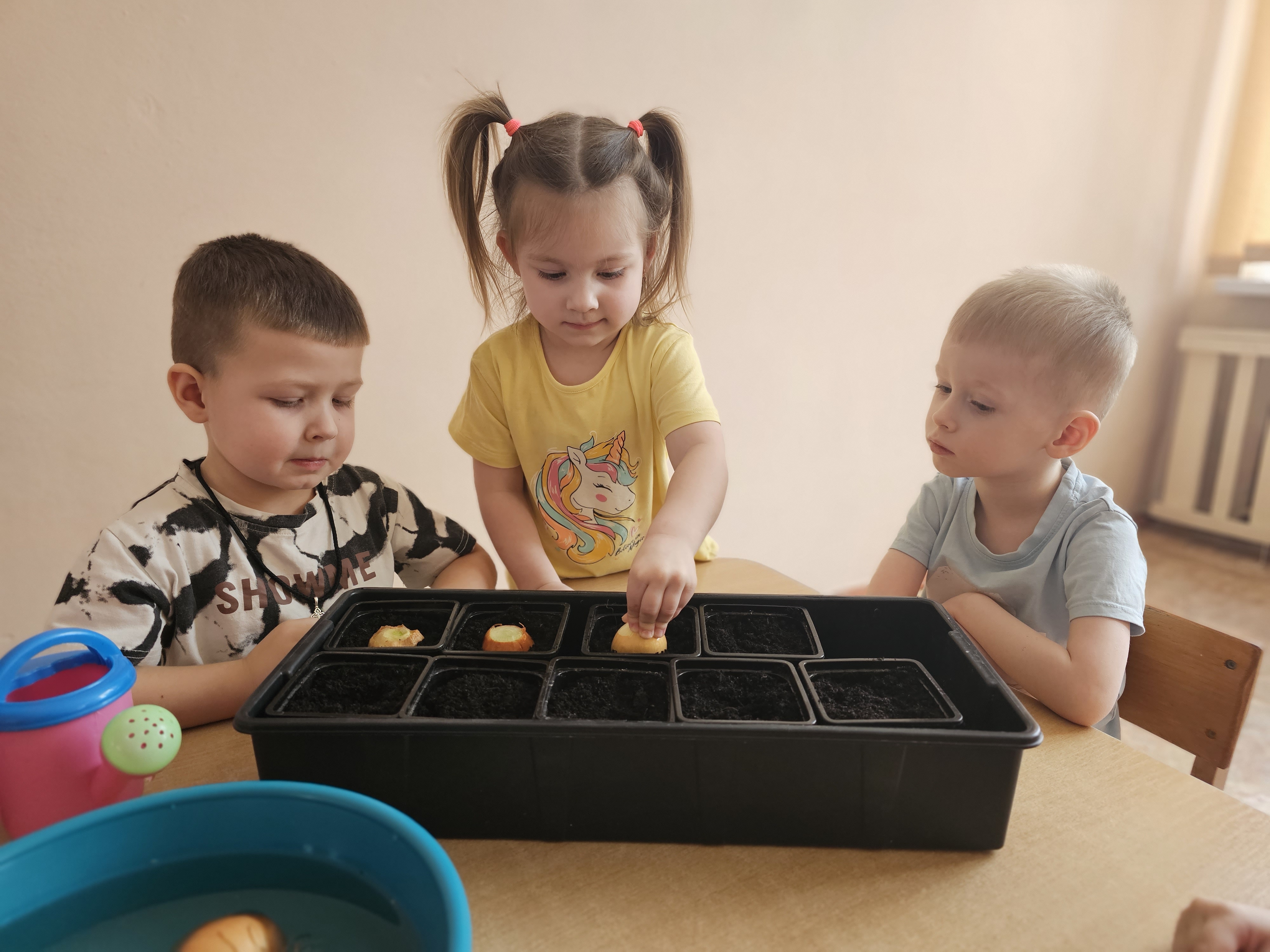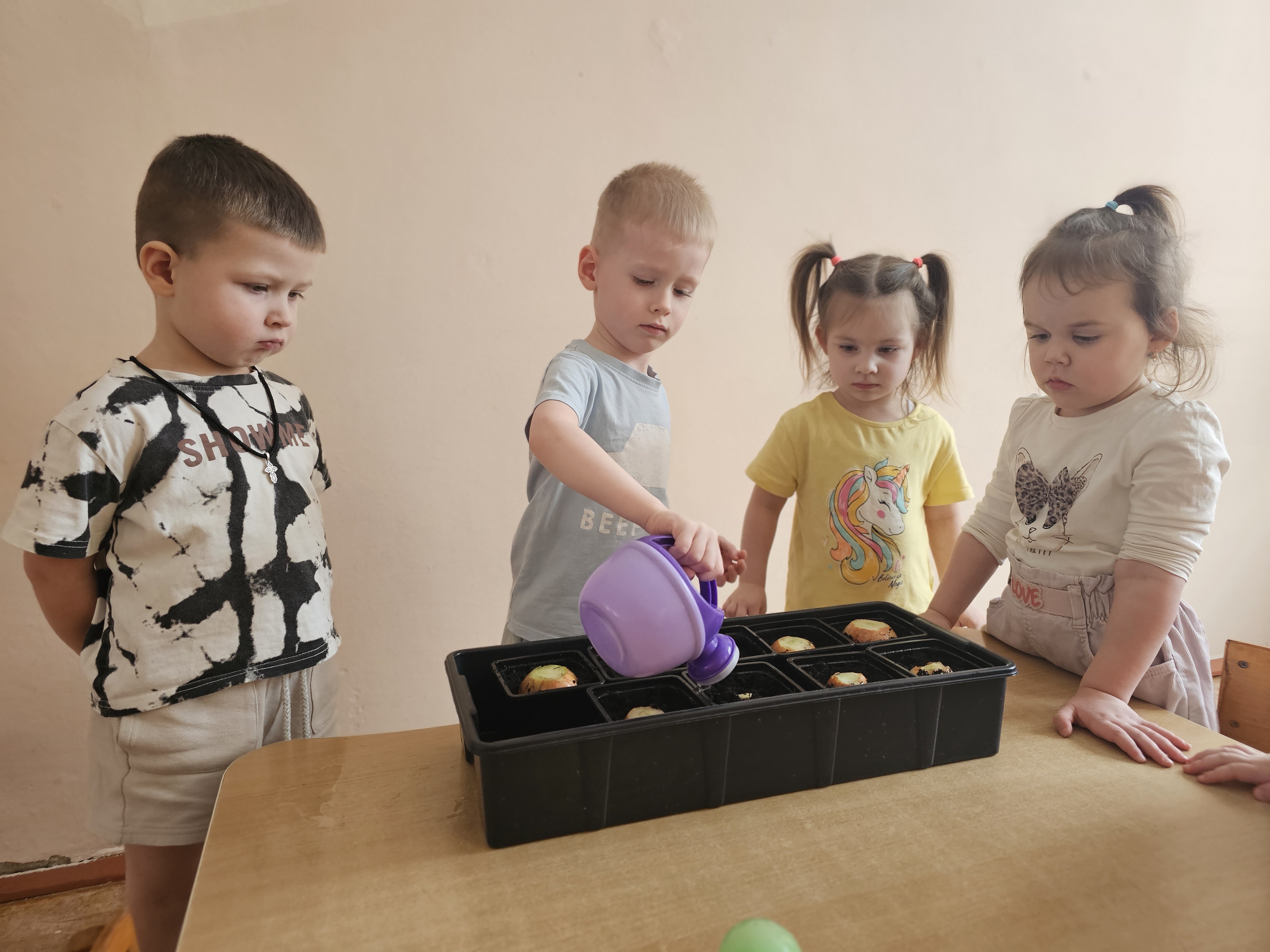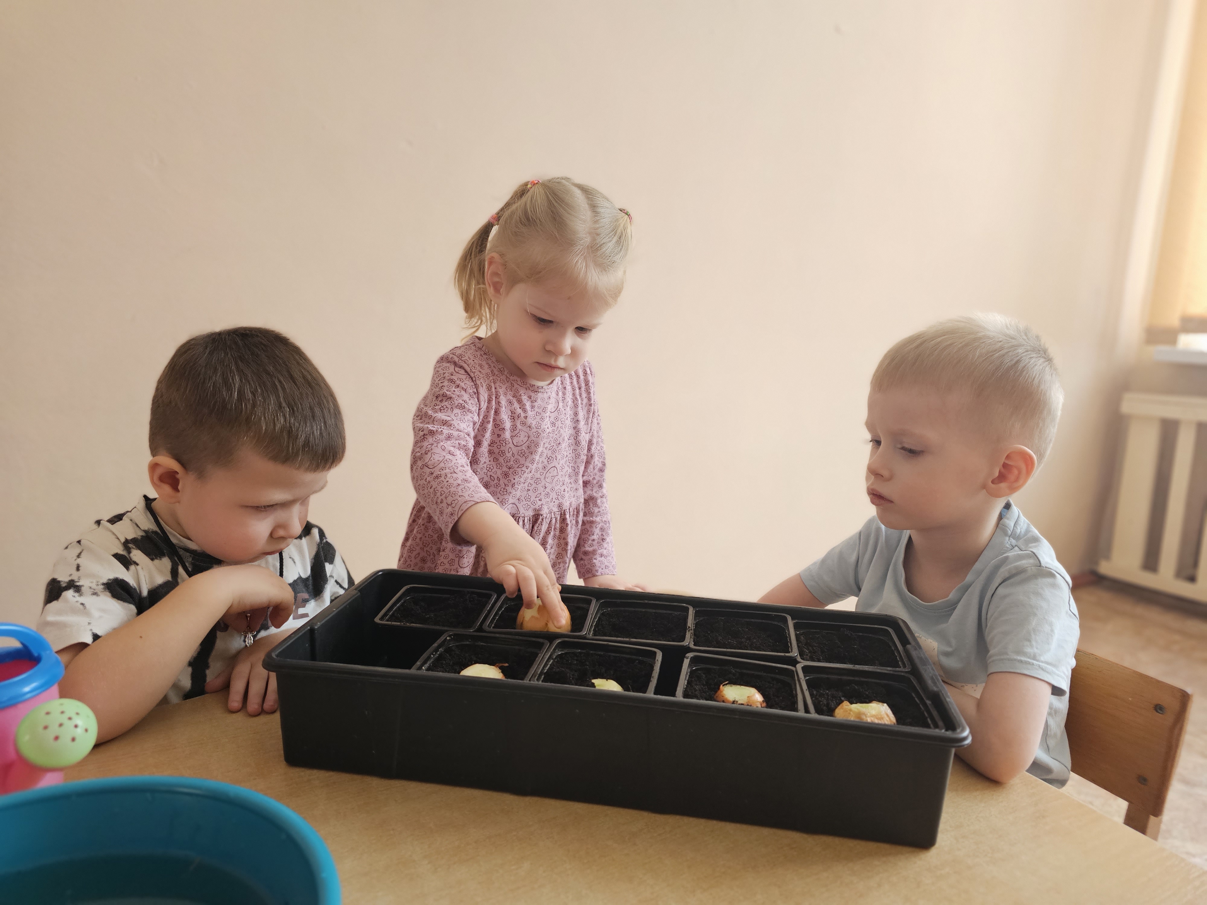 Ребята первой младшей "А" группы старательно и с желанием посадили лук. Малыши с интересом знакомились с луковицами, узнавали об их пользе и под руководством воспитателей учились сажать их в землю. Дети с увлечением участвовали в общем деле, развивая мелкую моторику и трудовые навыки, а теперь будут с нетерпением ждать первых зеленых всходов.