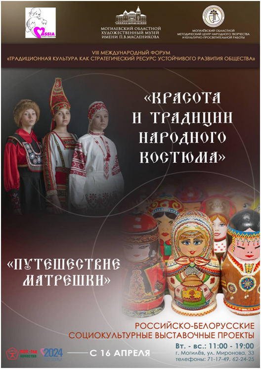 Выставочные проекты: « «Путешествие матрешки», «Красота и традиции народного костюма»16 апреля в Могилевском областном художественном музее имени П.В. Масленикова открылись выставочные проекты: « «Путешествие матрешки», «Красота и традиции народного костюма» – фонд МИССИЯ. Все эти проекты объединяют идеи сохранения народной культуры и истории культурного наследия. В экспозиционном пространстве будут представлены матрешки и костюмы, созданные ребятами-воспитанниками детских домов.