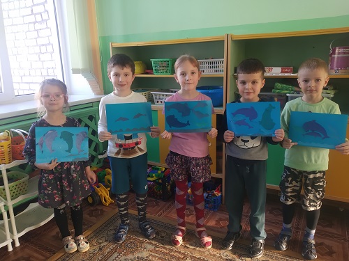 Беседа о море, рассматривание иллюстраций с изображением дельфинов вызвали у детей старшей группы большой интерес. В результате появились очень интересные аппликации «Дельфины в море» из цветной бумаги.