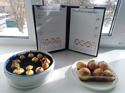 Вместе мы подготовили материал для нашего опыта: контейнеры, лук, воду, землю, дневник для наблюдения. Часть лука высадили в контейнеры с землей, а другую часть - в воду, и нашли теплое и светлое место для наших луковиц.