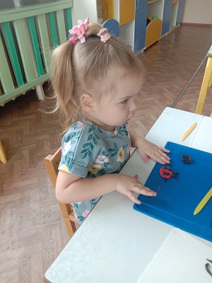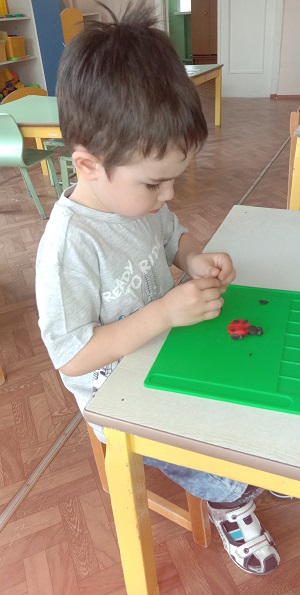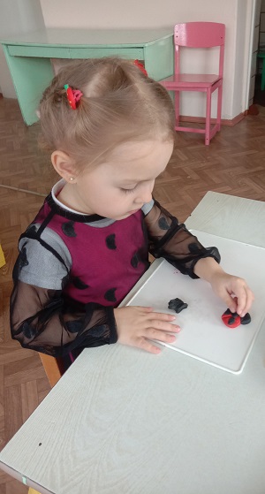На прогулке ребята второй младшей группы «А» наблюдали за божьими коровками, а затем учились передавать особенности внешнего вида божьей коровки с помощью пластилина.