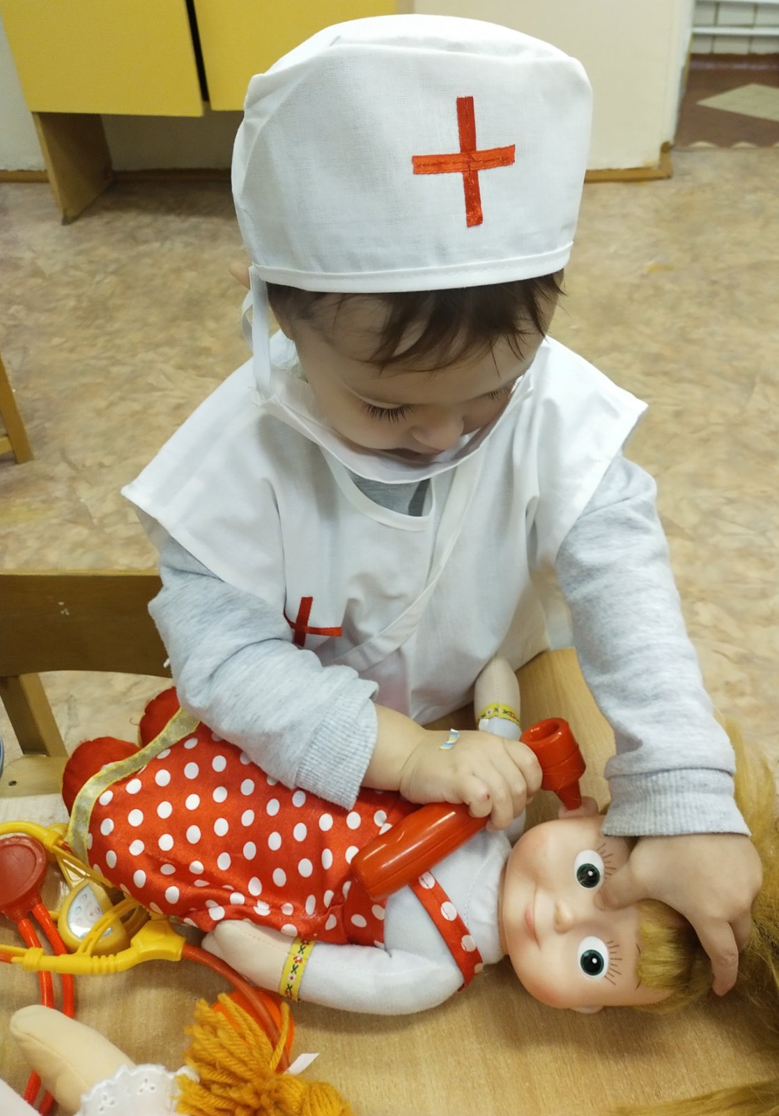 С целью формирования навыков ролевого поведения, способствующих становлению самостоятельной сюжетной игры, в первой младшей группе была организована сюжетно-отобразительная игра "На приёме у врача." В ходе игры ребята знакомились с предметами, необходимыми врачу для работы, их назначением и использованием. Отображали свои впечатления, полученные в повседневной жизни. Ребята с удовольствием играли вместе, приходили друг к другу на приём, приносили больных кукол... Такие игры помогают малышам наладить общение со сверстниками, научиться оказывать помощь, проявлять внимание, и заботиться об окружающих.