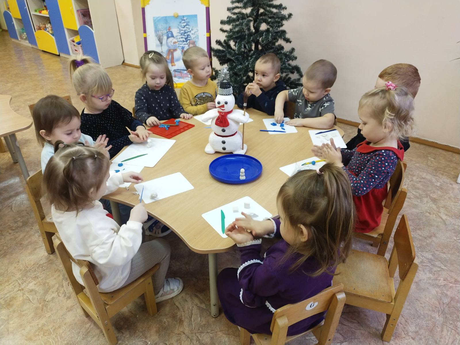 В гости к ребятам 1 младшей группы пришёл весёлый снеговик. Он рассказал ребятам о своём чудесном появлении. Под музыкальное сопровождение, имитируя движения, ребята рассказали и показали, как можно слепить снеговика из снега. Снеговик с удовольствием играл с ребятами, что вызвало много положительных эмоций. В конце занятия ребята слепили из пластилина таких же весёлых друзей для снеговика.