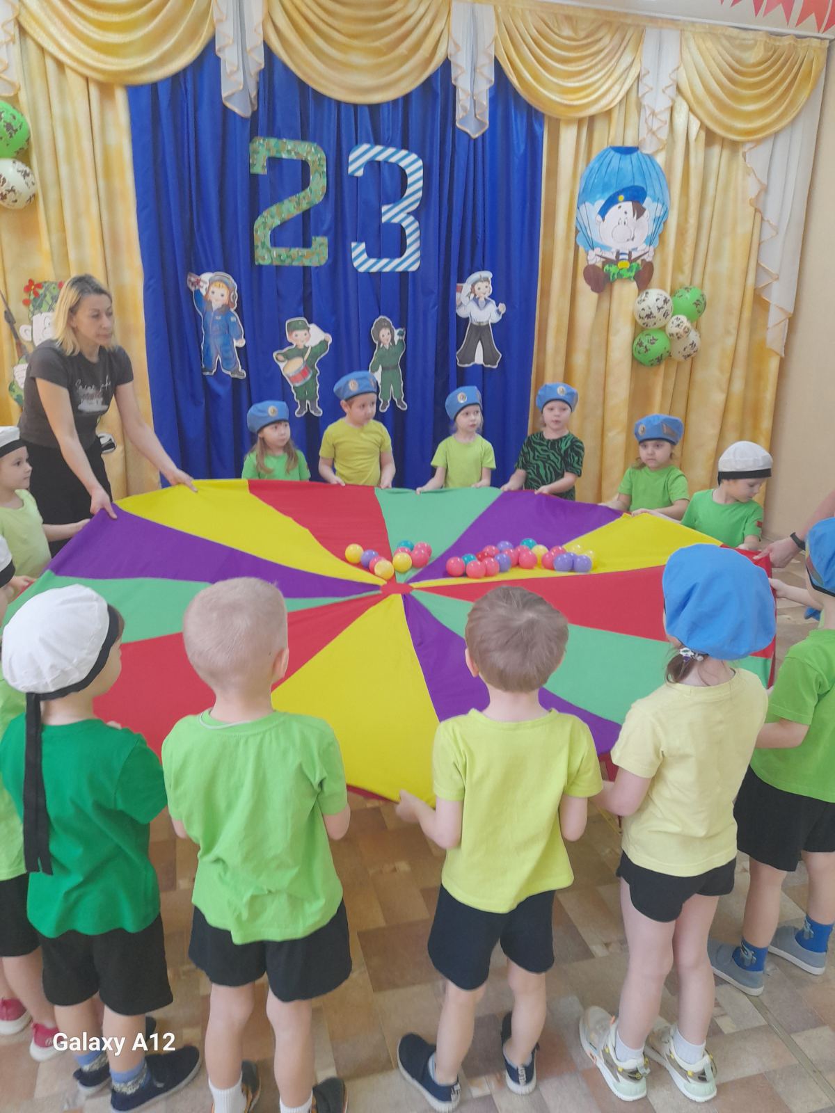 В завершении досуга в честь защитников Отечества ребята с помощью пособия "Парашют" запустили "салют".