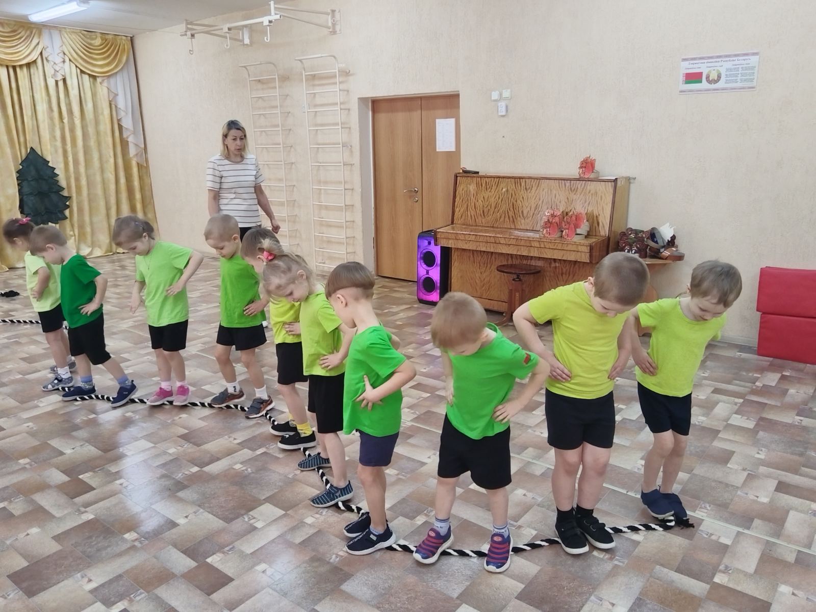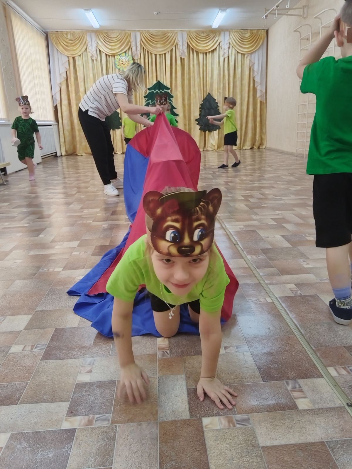 Ребята оказавшись в лесу, назвали приметы весны, а также вспомнили, кто из диких животных проснулся от зимней спячки. Превратившись в медвежат, показали, как медведь вылезает из берлоги (пролезание в тоннель на коленях и ладонях).