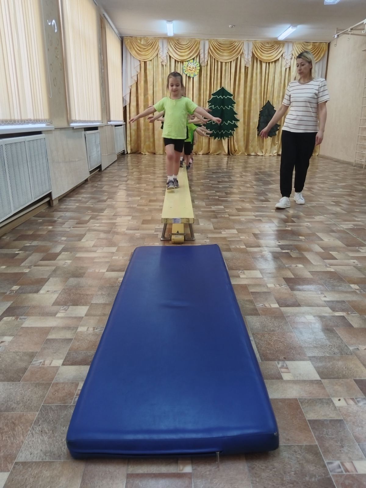 На физкультурном досуге ребята средней группы отправились в весенний лес. Дорога была трудной и по пути ребята преодолевали препятствия (выполнили ходьбу по гимнастической скамейке, с перешагиванием через препятствия, ходьбу приставным шагом на шуру, положенному на пол).