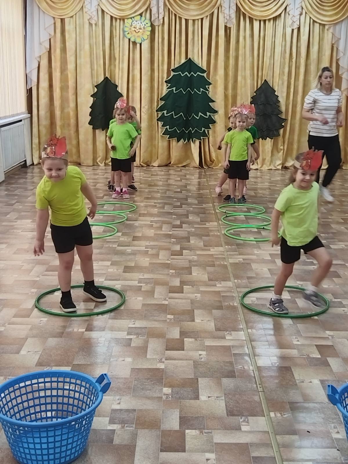 Под елочкой нашли корзину с шишками и, превратившись в бельчат, ловко прыгали с ветки на ветку (прыжки из обруча в обруч) и поупражнялись в метании в цель (бросали шишки в корзину).
