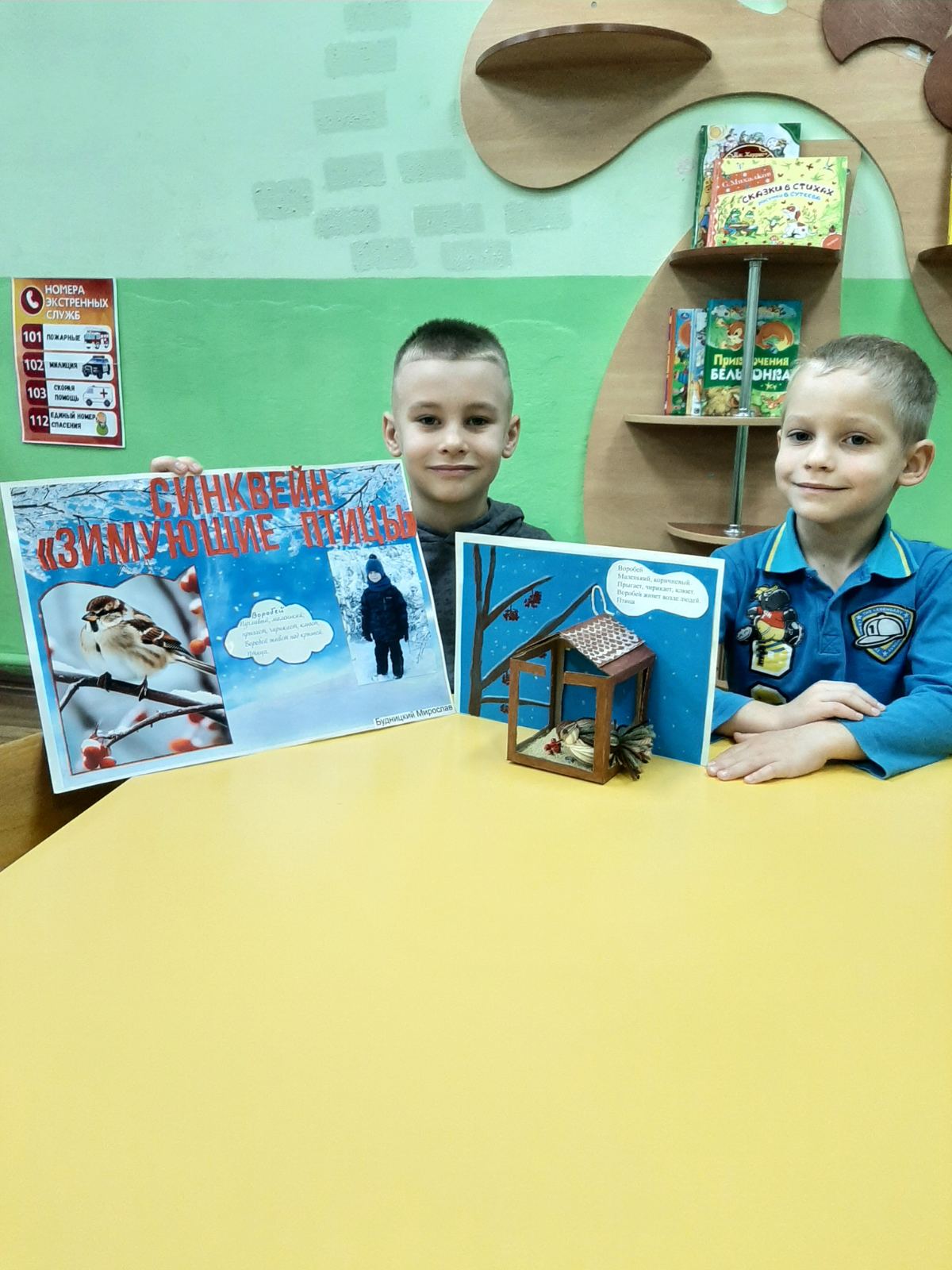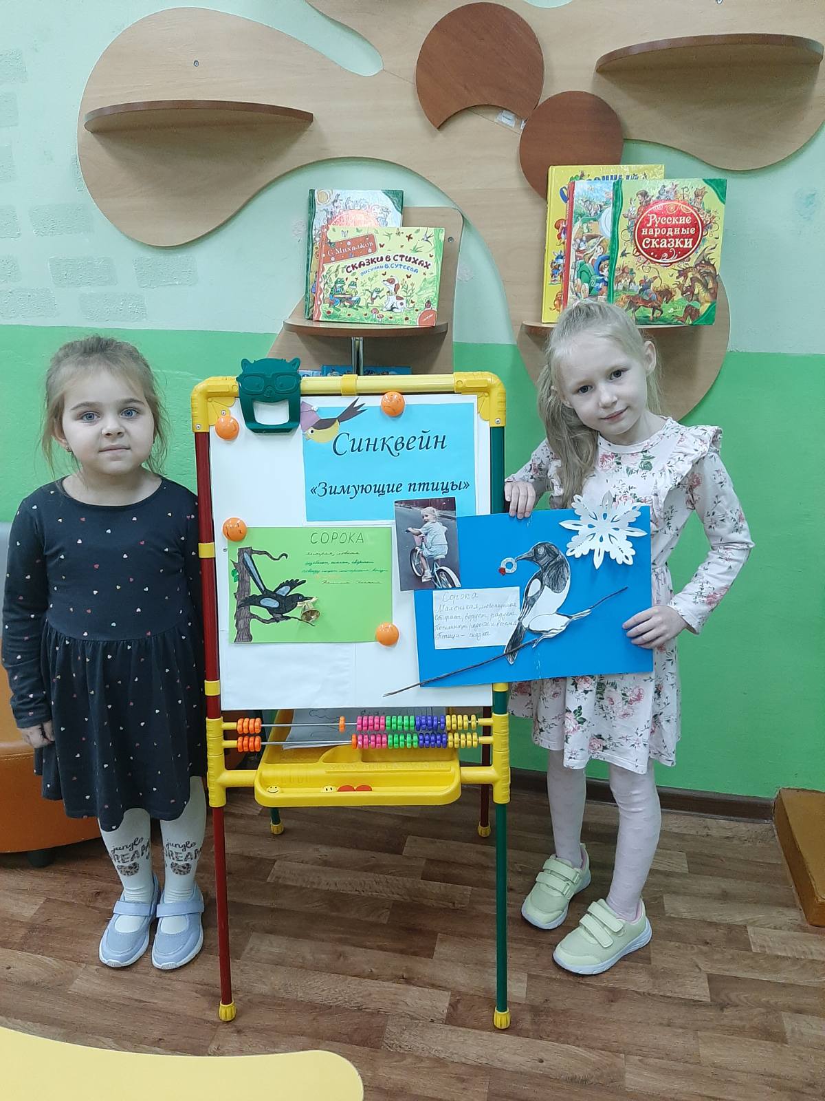 Это совместное творчество родителей и детей старшей группы. Яркие, объёмные, креативные работы, доставили радость детям и взрослым. Для изображения птиц они использовали различные материалы: нитки, дерево, бумагу, пластилин.Составление синквейна помогло расширить представления о зимующих птицах, пополнить словарный запас у детей, напомнило взрослым и детям о гуманном отношении к природному миру.