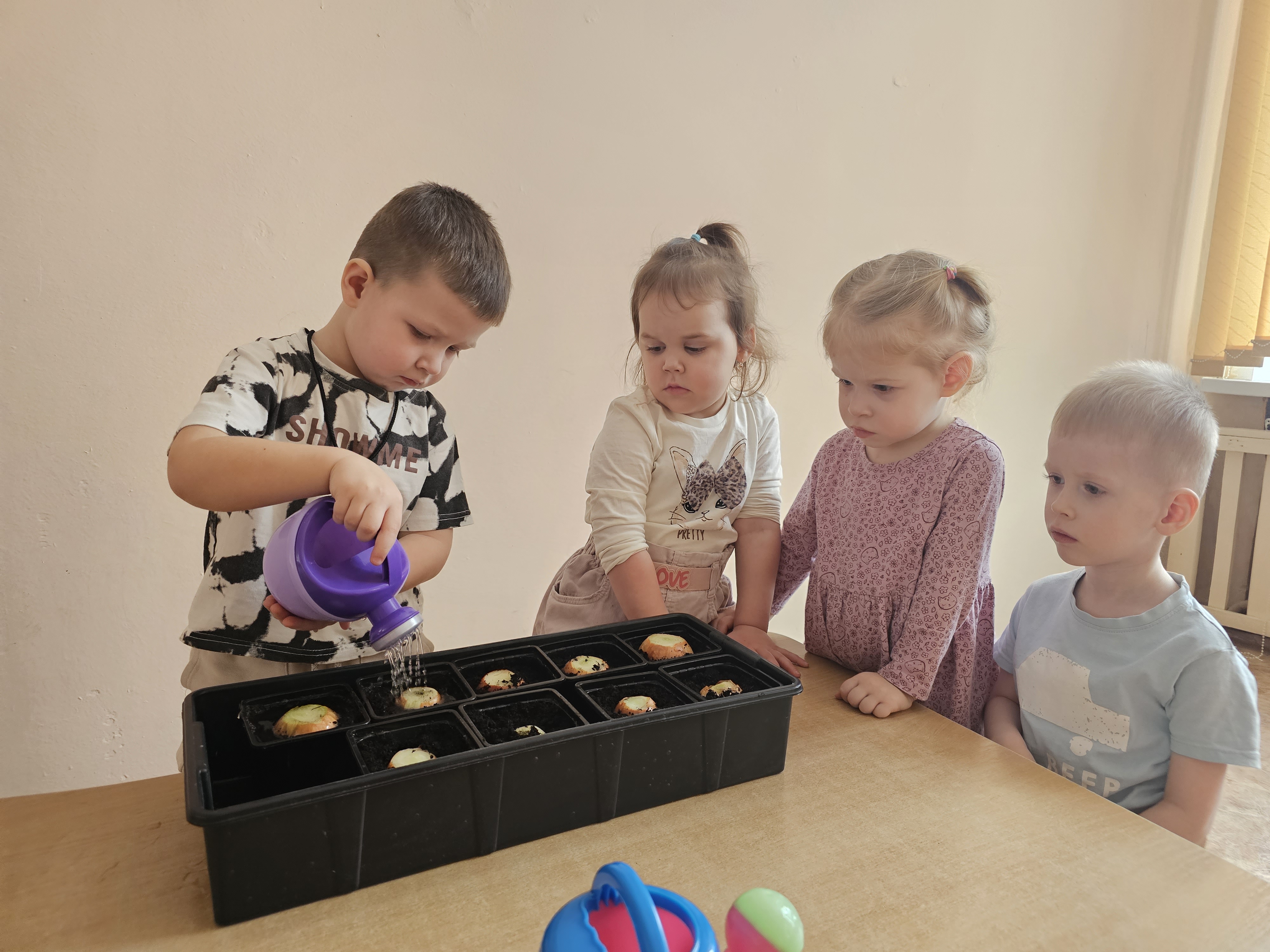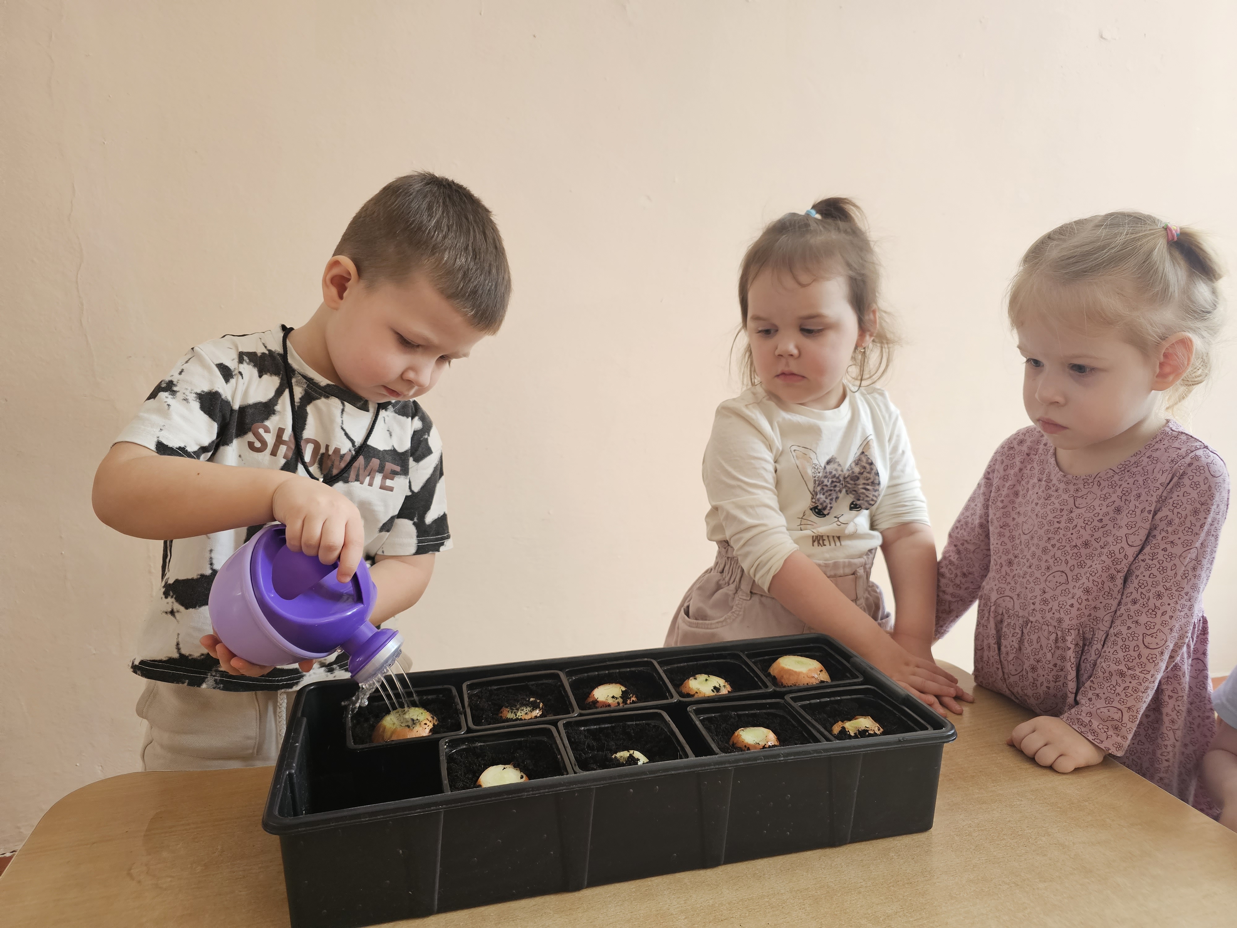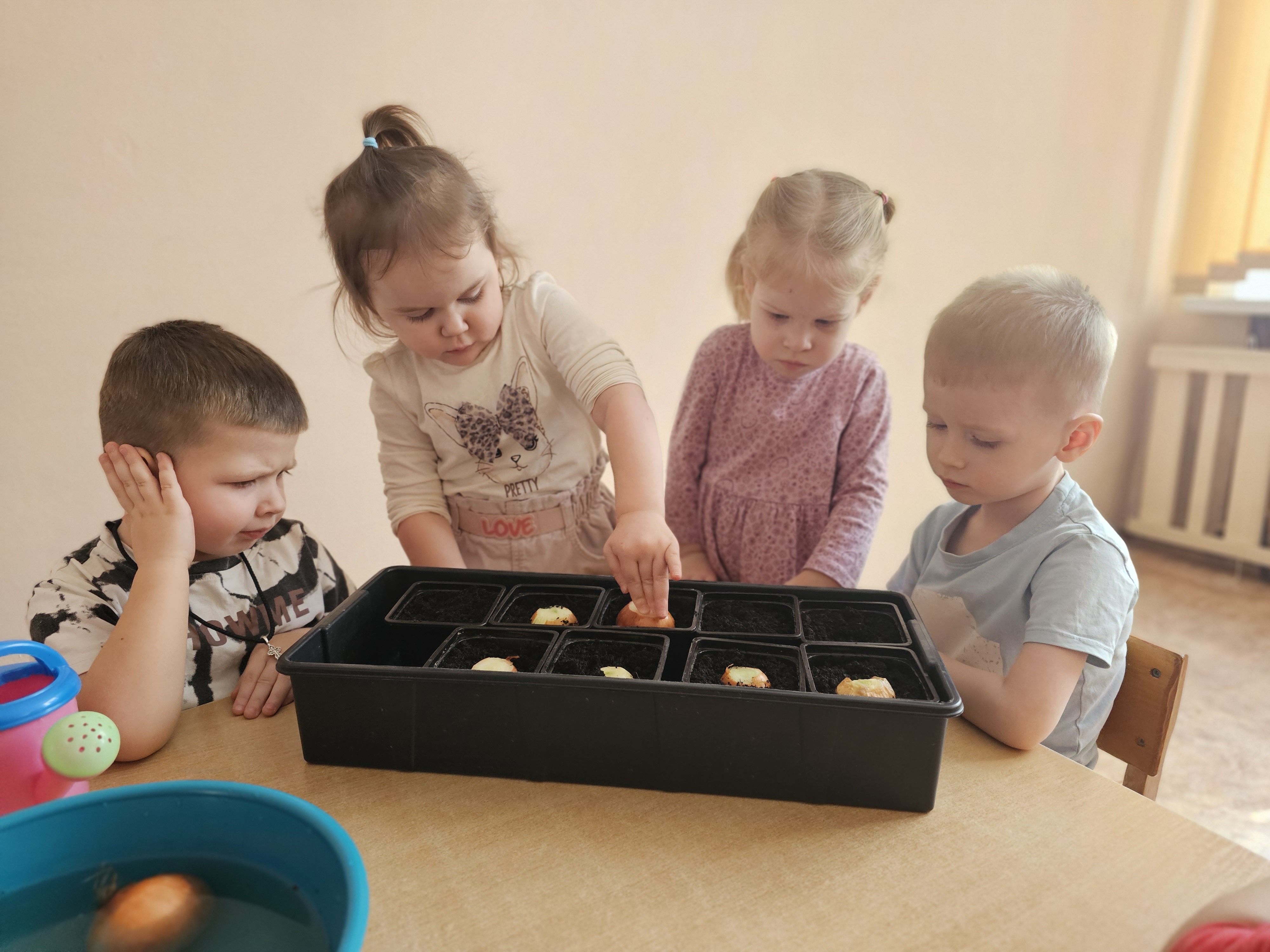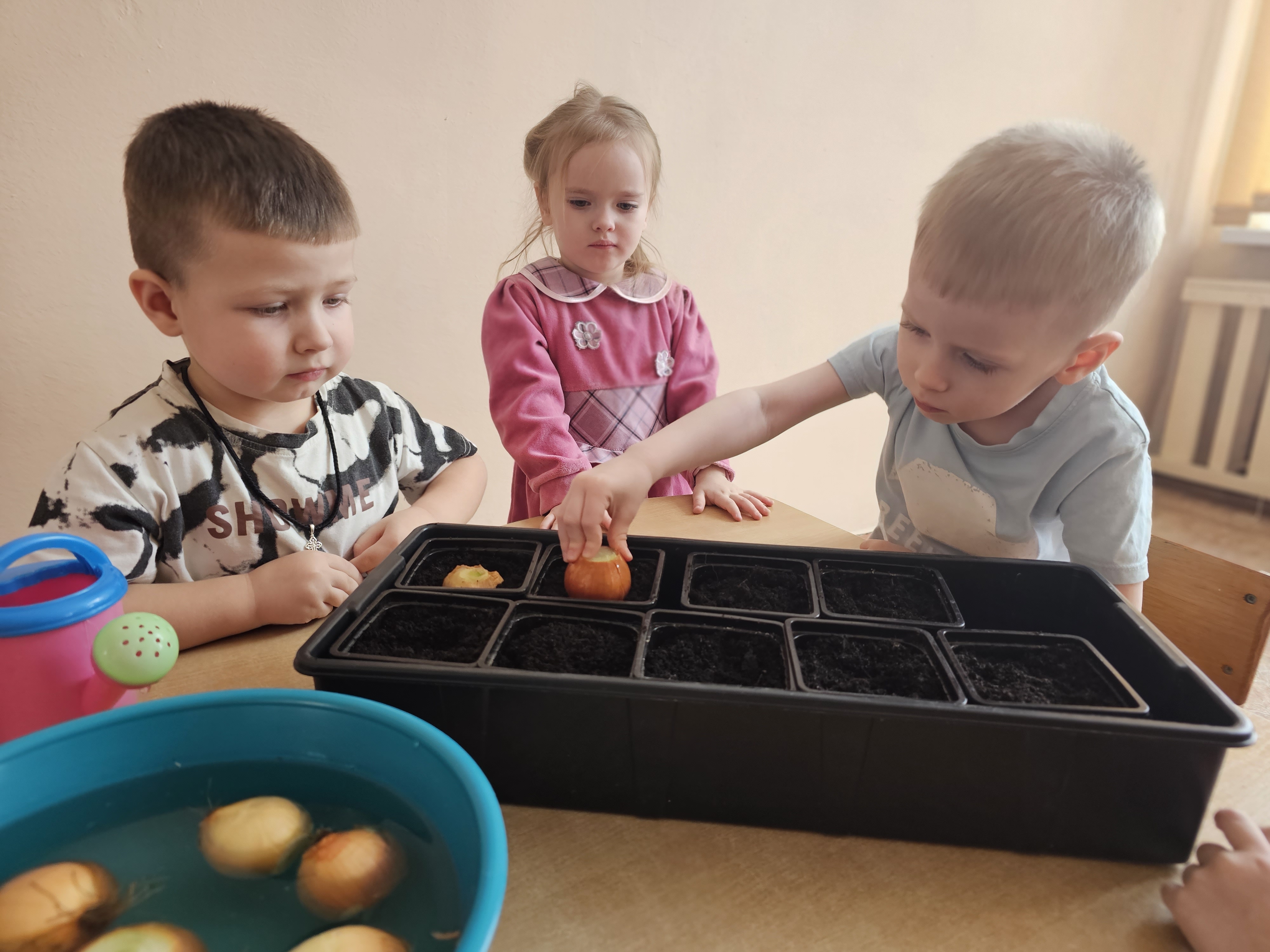 Ребята первой младшей "А" группы старательно и с желанием посадили лук. Малыши с интересом знакомились с луковицами, узнавали об их пользе и под руководством воспитателей учились сажать их в землю. Дети с увлечением участвовали в общем деле, развивая мелкую моторику и трудовые навыки, а теперь будут с нетерпением ждать первых зеленых всходов.